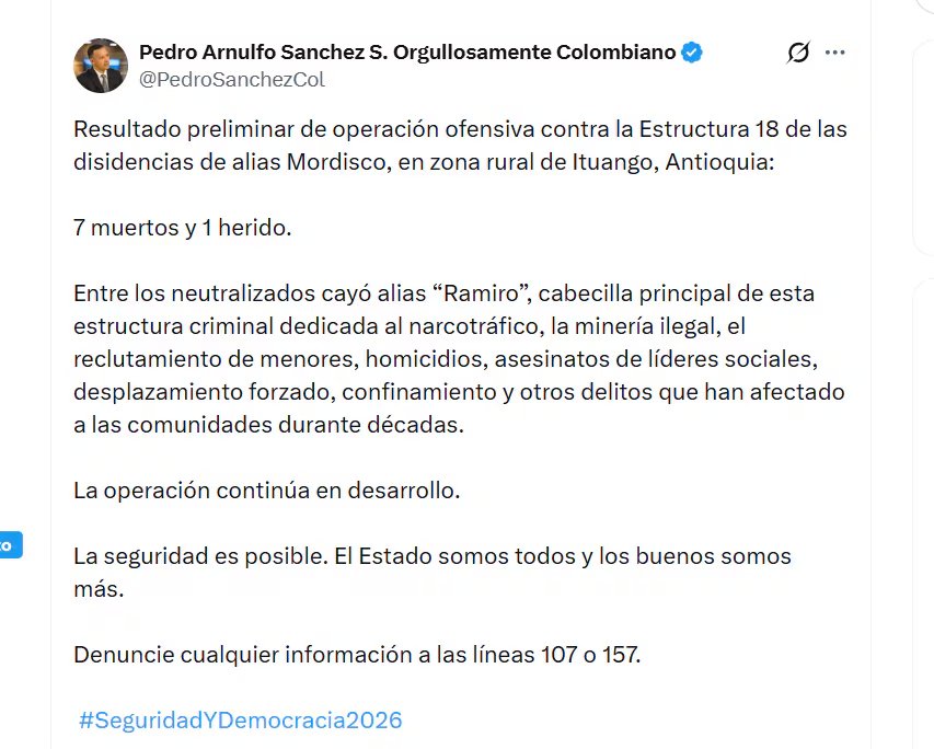 “Resultado preliminar de operación ofensiva contra la Estructura 18 de las disidencias de alias Mordisco, en zona rural de Ituango, Antioquia: 7 muertos y 1 herido. Entre los neutralizados cayó alias “Ramiro”, cabecilla principal de esta estructura criminal dedicada al narcotráfico, la minería ilegal, el reclutamiento de menores, homicidios, asesinatos de líderes sociales, desplazamiento forzado, confinamiento y otros delitos que han afectado a las comunidades durante décadas. La operación continúa en desarrollo. La seguridad es posible”