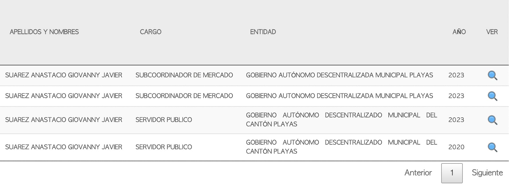 Una búsqueda partiendo con la cédula de Suárez, que consta en la documentación del proceso de contratación, revela que tuvo dos cargos distintos en el Municipio de Playas, entidad contratante, entre 2020 y 2023 según las declaraciones patrimoniales juramentadas que constan en el sitio web de la Contraloría General del Estado. Primero se desempeñó como servidor público y luego como subcoordinador de mercado: