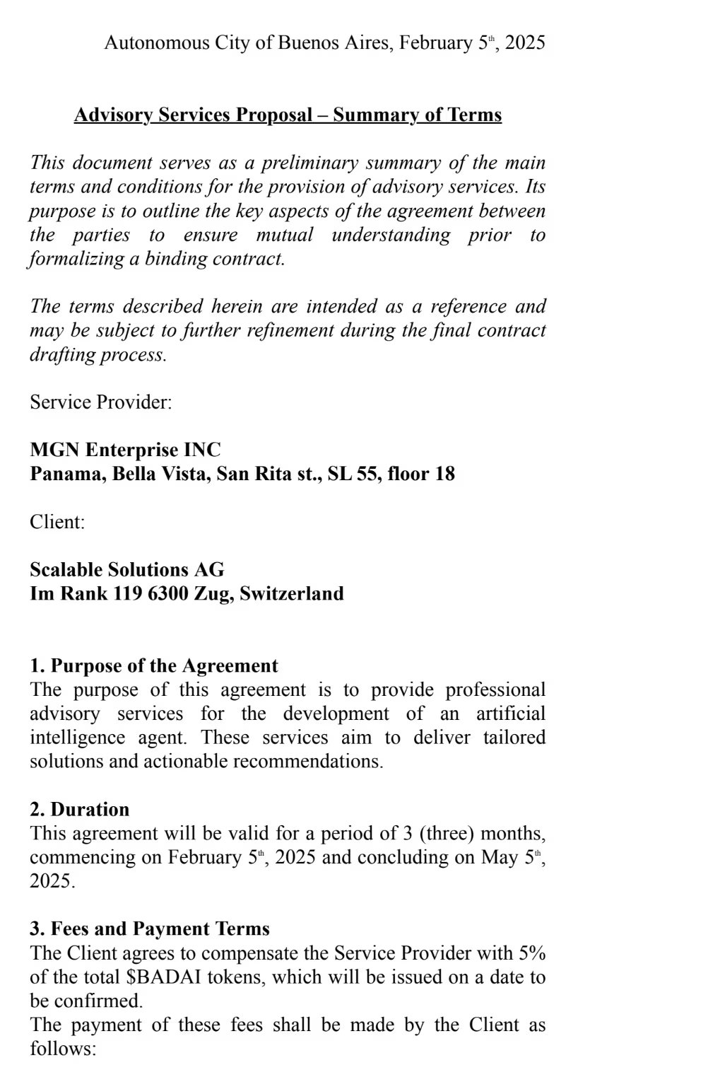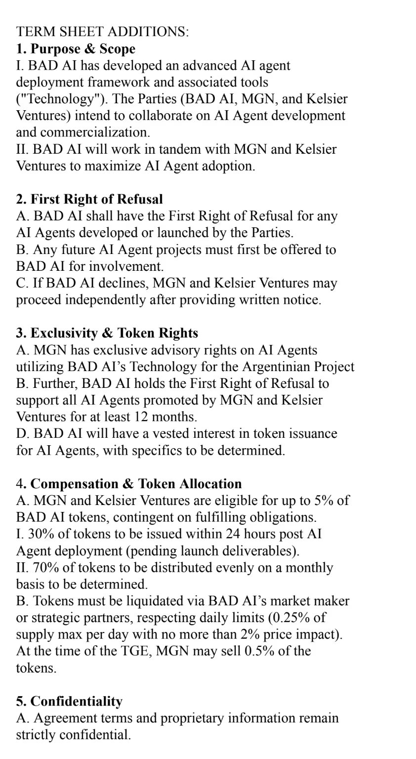 El 4 de febrero, Novelli abrió una caja de seguridad en el Banco Galicia. Un día después, su firma panameña MGN Enterprise INC firmó un contrato con la suiza Scalable Solutions AG para servicios de inteligencia artificial. Además, el 11 de febrero, se vinculó con Kelsier Ventures y BAD AI para el lanzamiento del token Bad Idea AI.