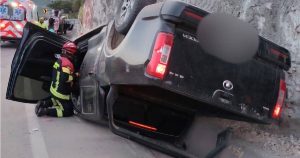 Una camioneta de color negro terminó con las llantas hacia arriba y arrimada hacia una