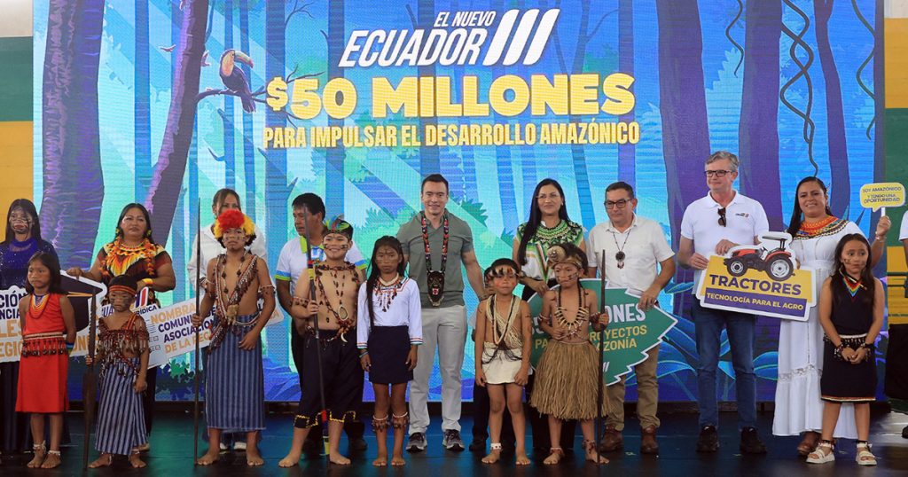 Este 17 de abril el presidente Daniel Noboa Azin lideró la Cumbre Amazónica en la ciudad del Puyo, un espacio de articulación interinstitucional orientado a impulsar el desarrollo integral de la región. Durante la jornada, el Mandatario anunció la entrega de más de USD 50 millones para la ejecución de 58 proyectos prioritarios que fortalecerán el acceso a servicios, la infraestructura y las oportunidades productivas en la Amazonía. Además, a través del Ministerio de Agricultura, Ganadería y Pesca (MAGP), se entregaron insumos, maquinaria y herramientas para fortalecer la producción agropecuaria.