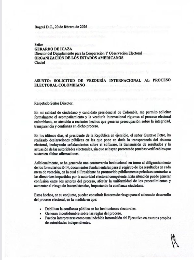 “Hoy solicité formalmente ante las Naciones Unidas y la Organización de Estados Americanos una veeduría formal al proceso electoral colombiano. Lo hago porque cuando un presidente de la República pone en duda las elecciones sin pruebas, pone en duda la democracia”.