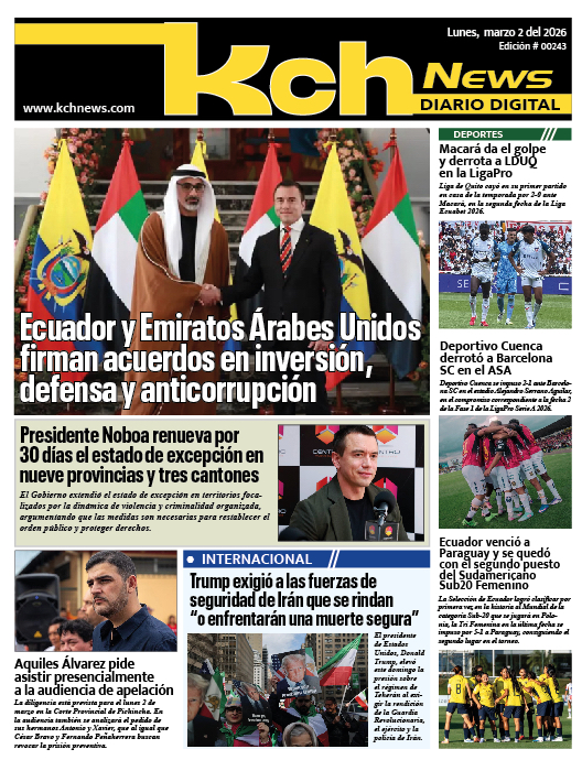 EDICIONES Descarga las últimas ediciones completa de Kch News en formato PDF. LUNES 2 DE MARZO DEL 2026 Edición: 243 LUNES 2 DE MARZO DEL 2026 Edición: 243 VIERNES 27 DE FEBRERO DEL 2026 Edición: 242 JUEVES 26 DE FEBRERO DEL 2026 Edición: 241 LUNES 23 DE FEBRERO DEL 2026 Edición: 238 VIERNES 20 DE FEBRERO DEL 2026 Edición: 237 JUEVES 19 DE FEBRERO DEL 2026 Edición: 236 MIERCOLES 18 DE FEBRERO DEL 2026 Edición: 235 MARTES 17 DE FEBRERO DEL 2026 Edición: 234 LUNES 16 DE FEBRERO DEL 2026 Edición: 233 VIERNES 13 DE FEBRERO DEL 2026 Edición: 232 JUEVES 12 DE FEBRERO DEL 2026 Edición: 231