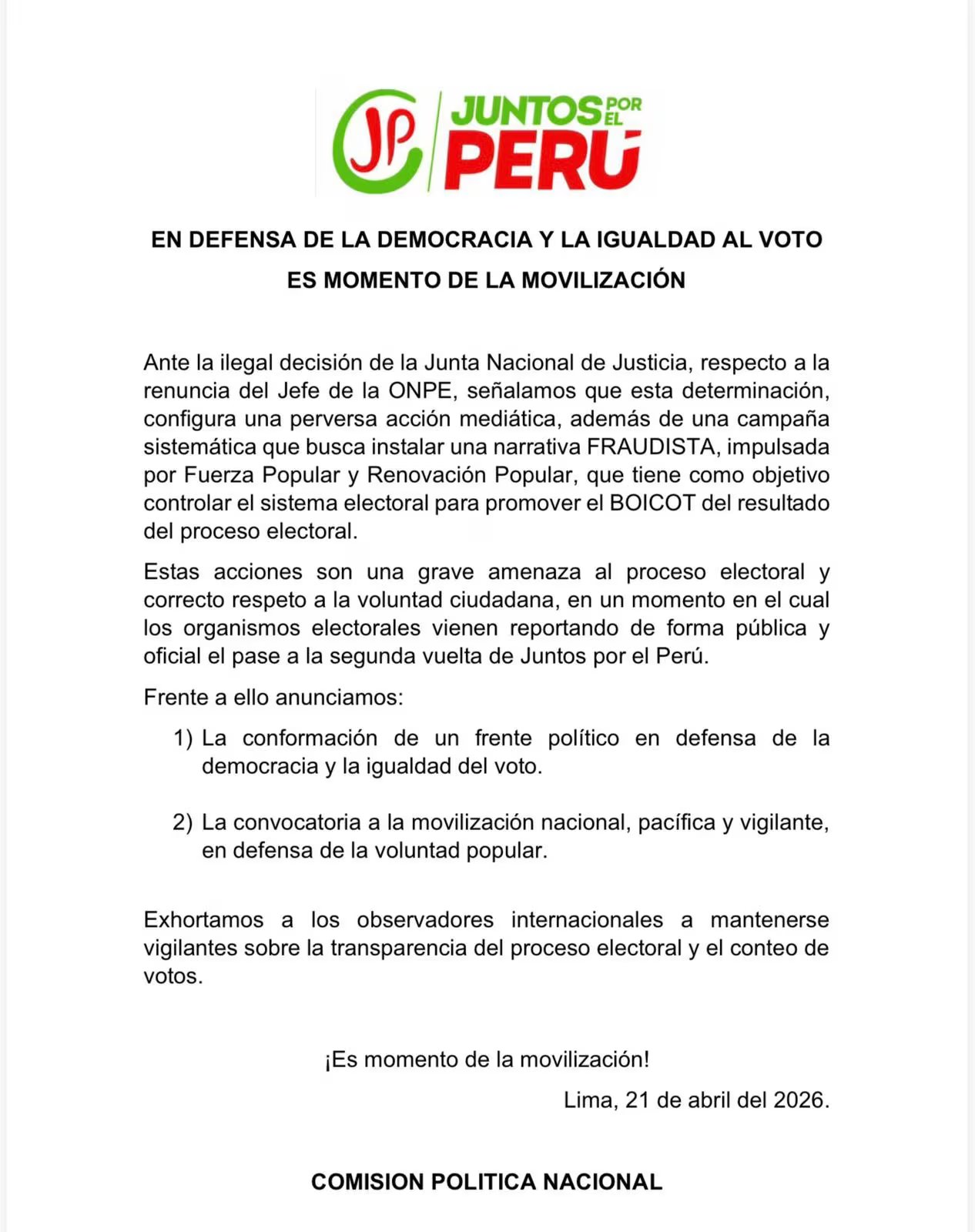 “Estas acciones son una grave amenaza al proceso electoral y correcto respeto a la voluntad ciudadana, en un momento en el cual los organismos electorales vienen reportando de forma pública y oficial el pase a la segunda vuelta de Juntos por el Perú”