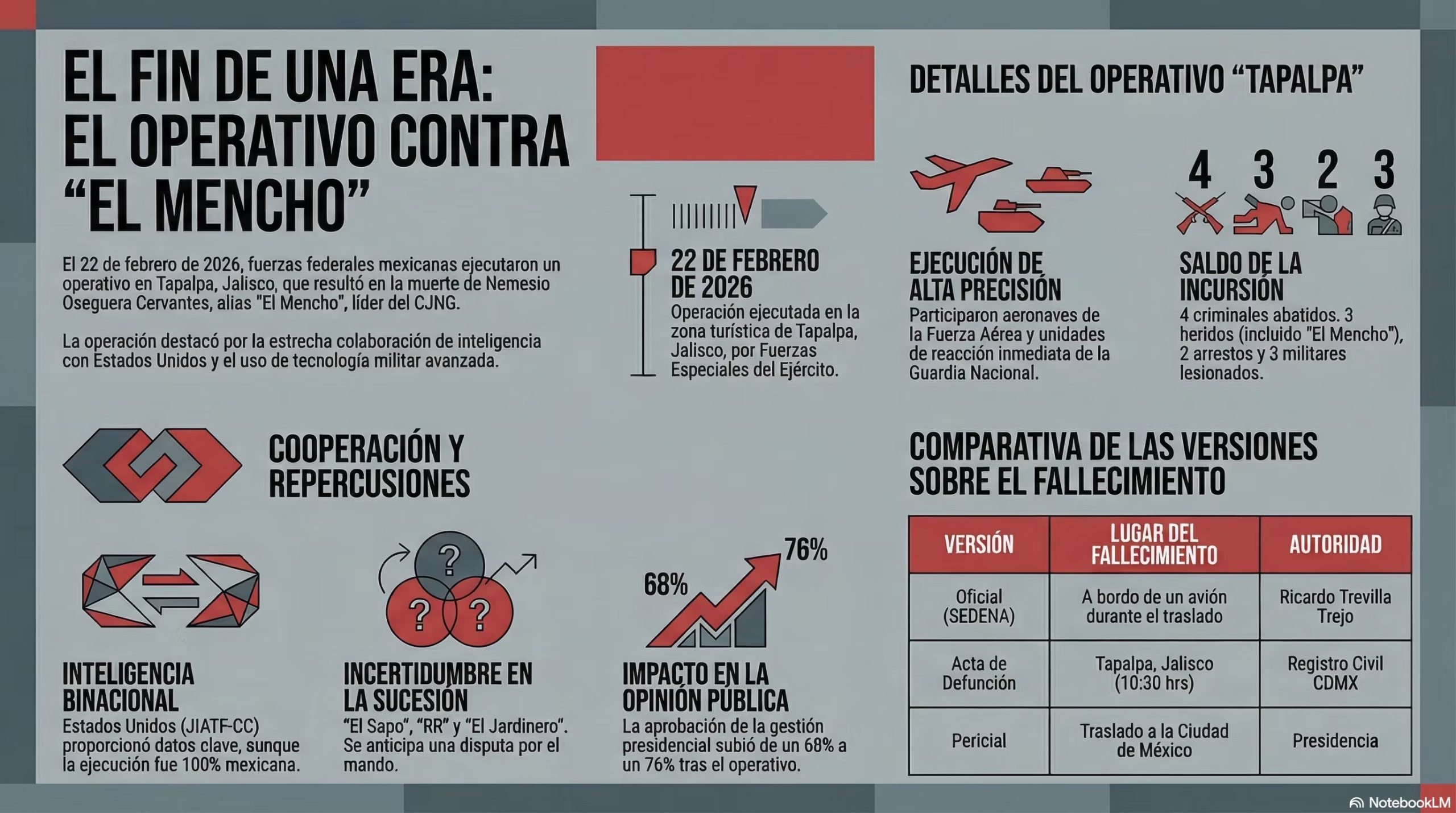 Según el relato oficial de los hechos, el plan original consistía en concretar la detención de El Mencho. No obstante, elementos de la Secretaría de la Defensa Nacional (Defensa) fueron recibidos con violencia por parte de grupos armados. Al repeler la agresión, se desencadenó un tiroteo en el que el capo resultó herido. Posteriormente, falleció mientras era custodiado y trasladado hacia la Ciudad de México.